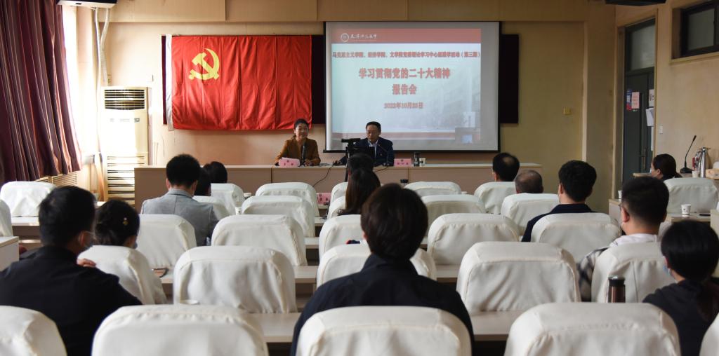 10月25日上午,马克思主义学院、经济学院、ABG欧博网官方网站党委理论学习中心组在兴文楼C区109报告厅开展联学活动,聚焦刚刚胜利闭幕的党的二十大,学习宣传贯彻党的二十大精神。马克思主义学院党委副书记、院长杨仁忠教授作专题报告,现场领导教师作学习交流分享,线上线下相结合,三院党委委员、领导班子、党支部书记和支委近100人参加学习,ABG欧博网官方网站党委书记李静主持联学活动。