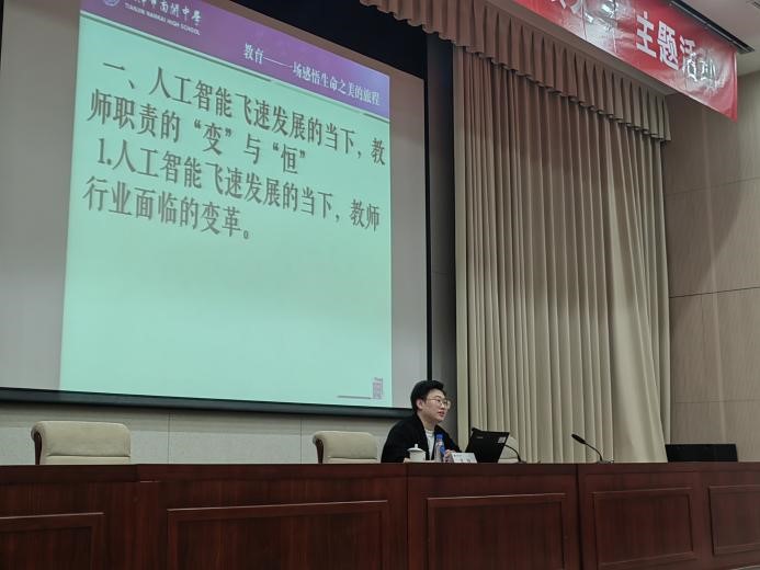 随后,高强老师就“教育——一场感悟生命之美的旅程”展开分享。首先谈论了人工智能飞速发展的当下,教师行业的“变”与“恒”。他提出,在这个时代,教师行业虽面临变革,但教育教学始终是不变的原点,鼓励大家在教育教学上下功夫,努力学习教学本领。