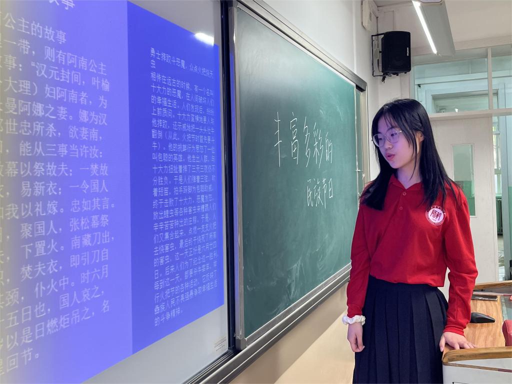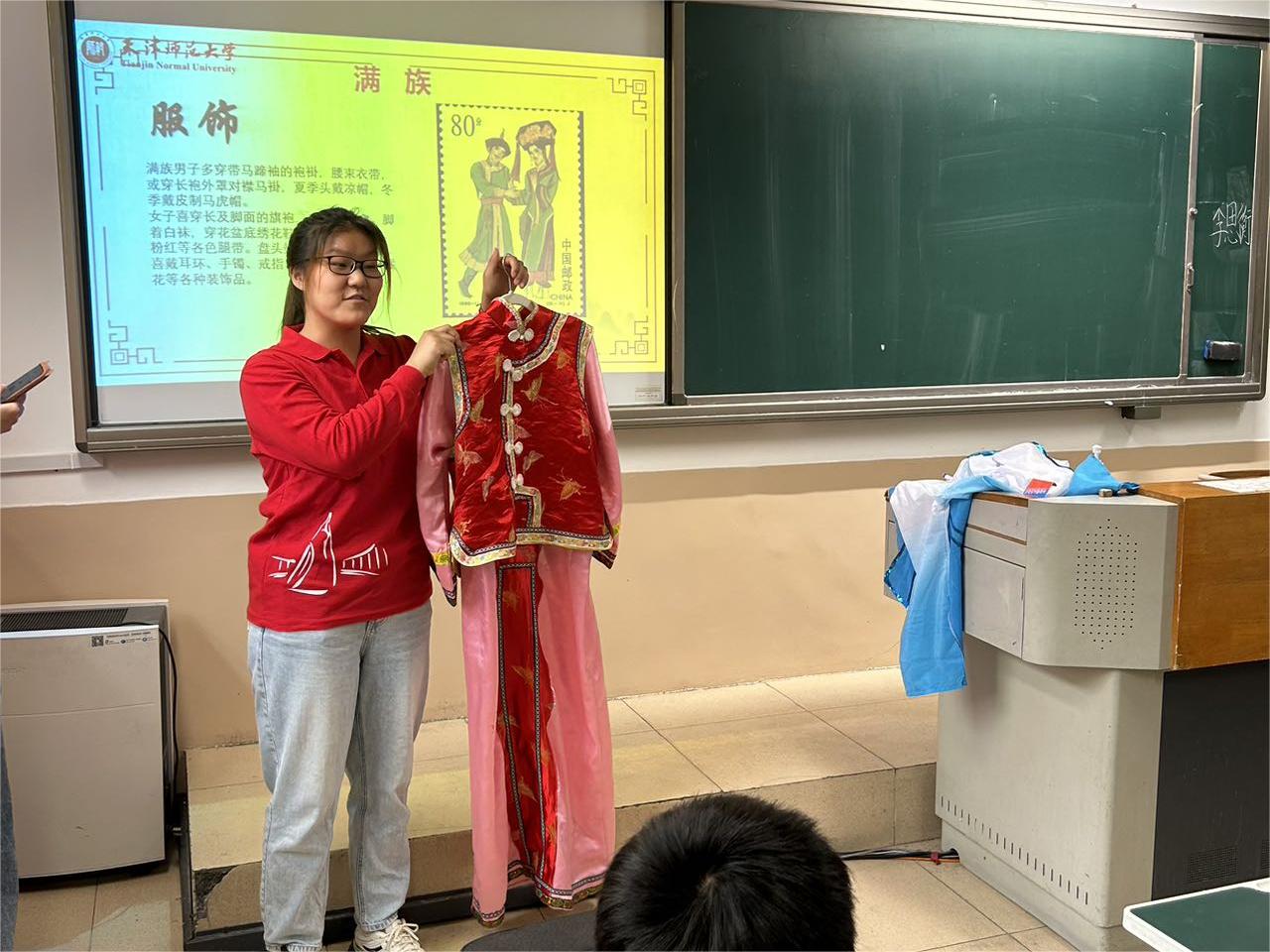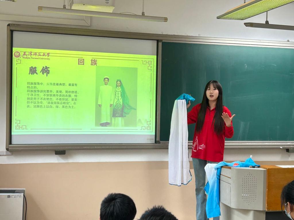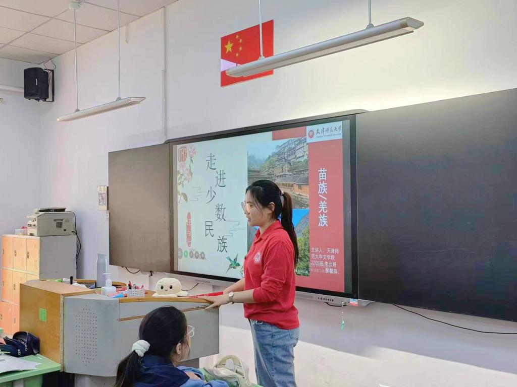 课堂上,志愿者们围绕少数民族传统节日、建筑、服饰、美食、美景等多个方面向小学生们介绍了彝族、苗族、羌族、裕固族、仡佬族等少数民族文化知识。泼水节、那达慕大会、火把节、开斋节等少数民族节日,羌族的碉楼、苗族的吊脚楼、千户苗寨等居民建筑,栈道、索道、马车等出行方式,彝族的坨坨面、苗族的三色饭、米豆腐,藏族的酥油茶、奶渣包等特色美食的讲解,既开阔了小学生们的眼界,又丰富了同学们的少数民族文化知识。志愿者们声情并茂的民族文化知识讲解,生动有趣的宣传视频展示,以及令人眼前一亮的民族服装展示与体验等环节,充分调动了小学生们对课程的兴趣与积极性。“击鼓传花”“有奖问答”等互动小游戏,更是营造了良好的师生互动课堂氛围。