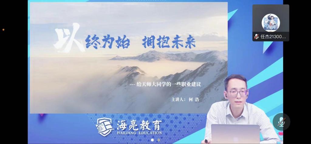 何浩总监以“以终为始,拥抱未来”为主题展开分享。他结合宏观经济环境对大学生的就业环境进行了分析了,建议同学们要做好自身职业生源规划,努力抓住当今科技创新背景下的市场机遇和就业机会。他还以自身经历为例,向同学们分享了他在大学期间的职业规划和毕业后的就业经验,提出了“提高认知,分析自己;理性规划,选择职业;制定目标,树立标杆;主动连结,建立善缘;加强学习,构筑壁垒;艰苦努力,保持阳光”等六点建议,鼓励大家结合自身兴趣优势,找到适合自己的职业方向,度过有意义的大学生活。最后,何浩总监详细介绍了海亮教育管理集团的发展现状与“海亮创新班”建设情况,并耐心回答了同学们所提出的问题。