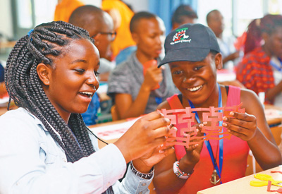 图为肯尼亚学生在中国文化体验课上学习剪纸。