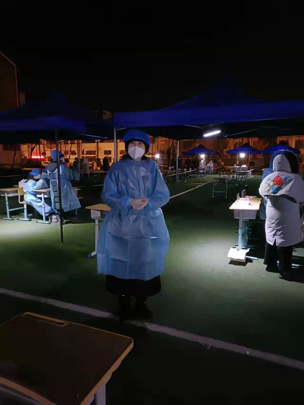 凌晨起,ABG欧博网官方网站的志愿者便起身服务。跨文化与世界文学研究院院长郝岚老师和比较文学与世界文学教研室甄蕾老师因同住一个社区,便结伴一起投入志愿服务工作,同时也联动师大其他学院的教师一起开展工作。她们身着一次性防护服,承担了引导、登记的工作,从天黑到天亮,从未停歇。甄老师也激动的在朋友圈中写道“民盟盟员也在抗疫一线向前冲”。