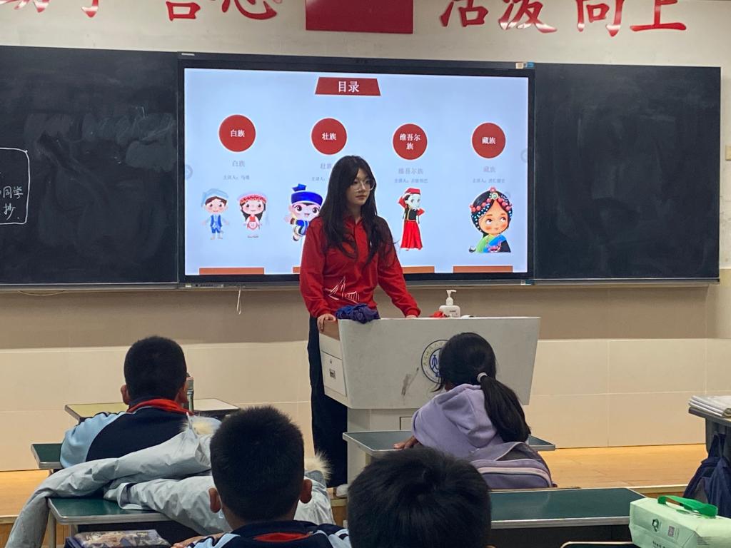 为铸牢中华民族共同体意识,使各民族团结奋斗的思想深入人心,11月30日下午,天津师范大学ABG欧博网官方网站2201班的“星火燎原”志愿服务队来到天津师范第三附属小学,以课后服务的形式开展了一堂别开生面的少数民族文化课程讲解。志愿者们通过展示、互动等多种方式,带领孩子们一起探索藏族、佤族、白族、壮族、维吾尔族等少数民族文化的深沉魅力。