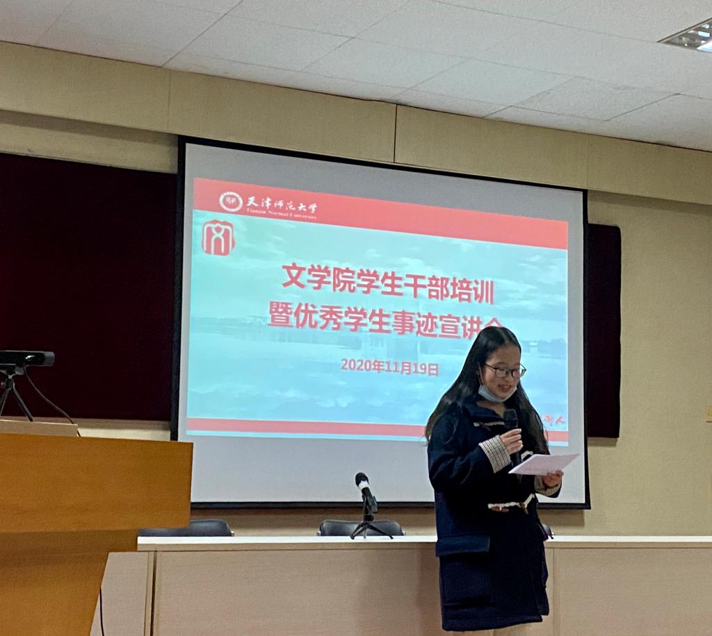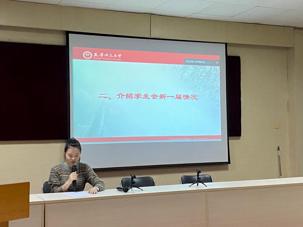 学生会轮值主席白雪对学生会组成人员、具体事务和相关部门进行具体介绍。此外,白雪结合自身班长职务,通过与大家分享所在班级荣获市级先进学生集体事迹,勉励大家作为学生干部一是要以身作则,以实际行动感染和服务身边同学;二是要换位思考,善于在工作中发现他人长处,共同为集体建设贡献力量;三是要学会沟通,主动架起老师与同学之间沟通的桥梁,服务师生,提升自我。