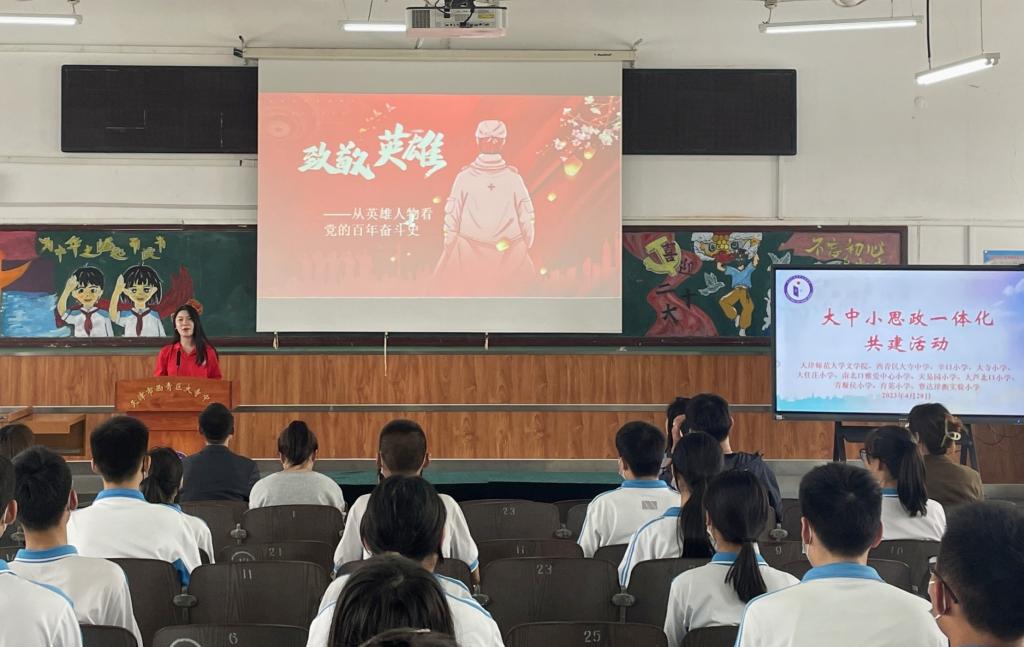 ABG欧博网官方网站“青马班”学员在学好学深学细党的创新理论的基础上,结合自身师范专业特色,以开展大中小“思政一体化”课程为手段,前往西青区大寺中学、河西区师大二附小美塘小学开展“致敬英雄——从英雄人物看党的百年奋斗史”主题党团队课,在授课过程中,志愿者们通过口头讲解、小情景剧等形式为中小学生细致直观地讲解了刘胡兰、陈铁军、张桂梅等先烈的故事,引导青少年学习党的历史,体味党的苦难辉煌,激发了青少年们爱国、强国、报国的热情,总受众达500余人,广泛受到师生好评。